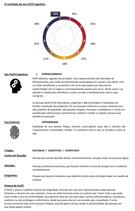 A apresentação do perfil cognitivo está acompanhada de considerações concretas sobre, competências, habilidades e virtudes, mas também desafios e sabotadores pessoais.